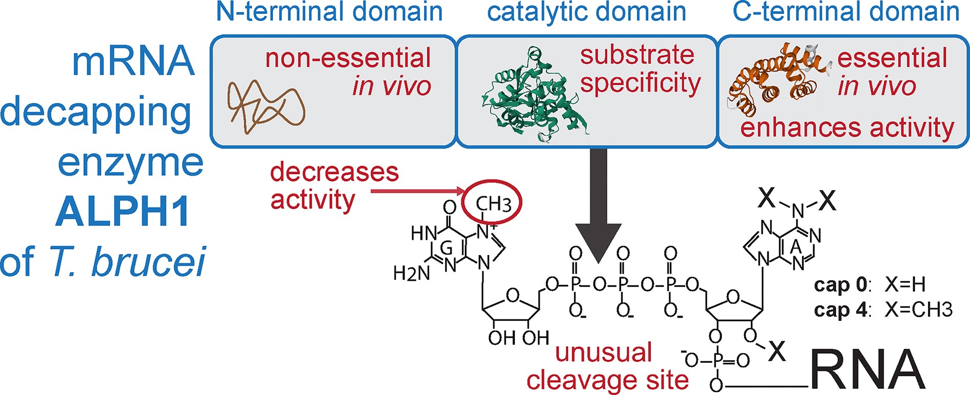 - ALPH1 prefers RNAs without m7G methylation, despite the heavy methylation of trypanosomal mRNA (cap 4)